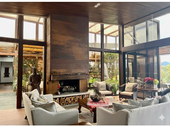 Estar con cubierta de vidrio templado en medio de un jardín espectacular y con chimenea de leña.
